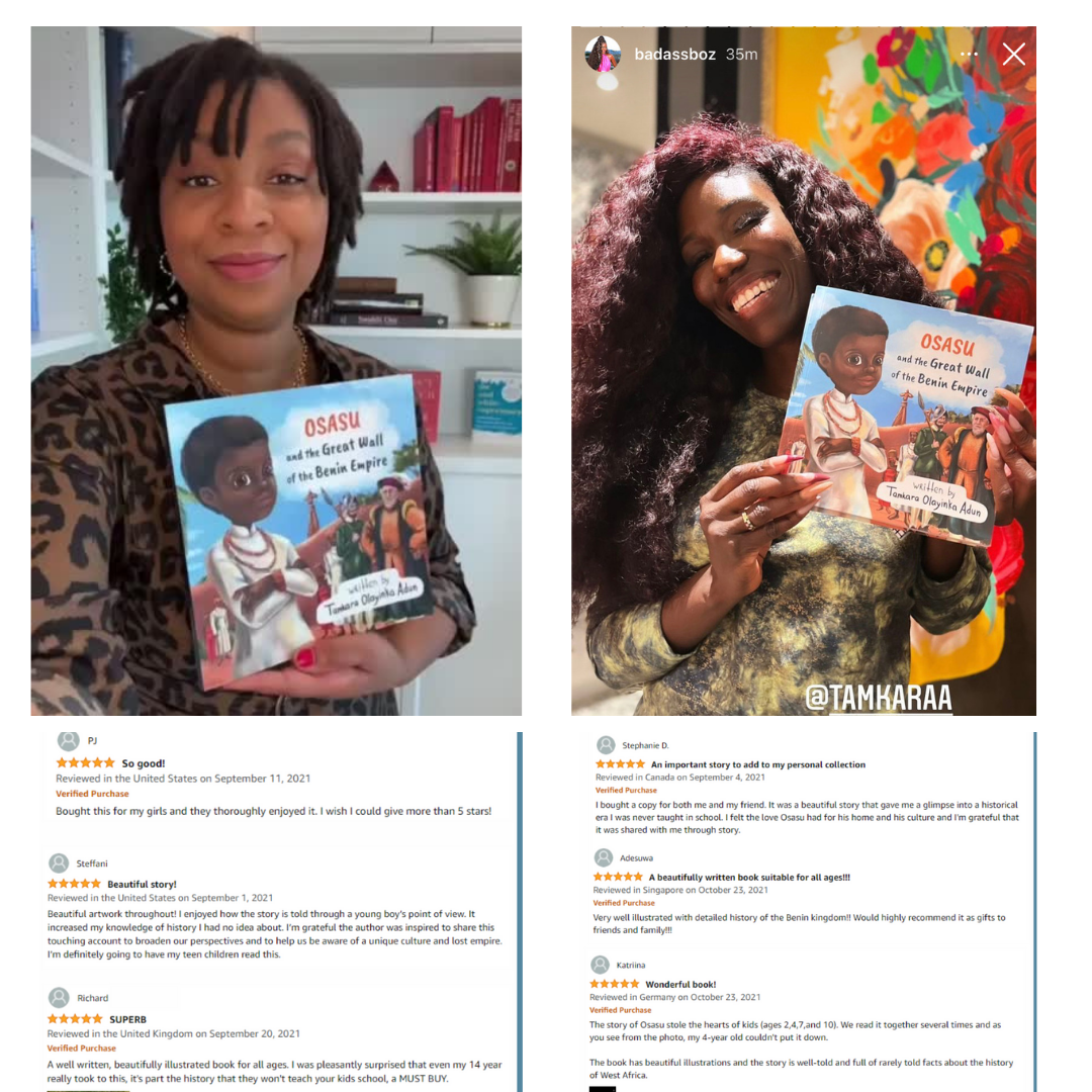 “Written for children but enlightening for readers of all ages, Osasu and the Great Wall of the Benin Empire provides a delightful view into a part of pre-colonial Africa. We are starved of these stories, and so desperately need to hear them. Tamkara’s wonderfully written story paired with beautiful illustrations give us an accessible way to understand African history and the history of European colonialism. And for those of us of African descent, it reminds us to be proud of our heritage and find strength in our ancestors.”- Layla F Saad